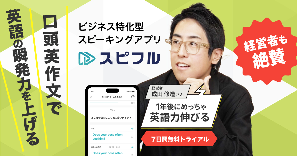 おすすめなのが、ビジネスシーンに特化した瞬間英作文アプリ「スピフル」です。出題される日本語を瞬時に英語に変換して口に出すトレーニングを繰り返すことで、頭で考えなくても英語がパッと出てくる「英語脳」の回路を構築できます。