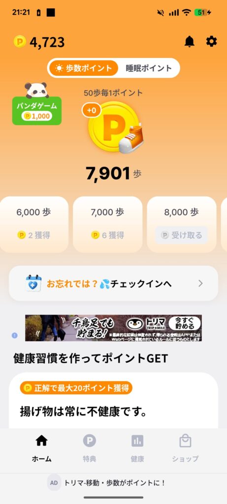 - 通常ポイント:50歩ごとに1ポイントが加算されます(上限5,000歩)。