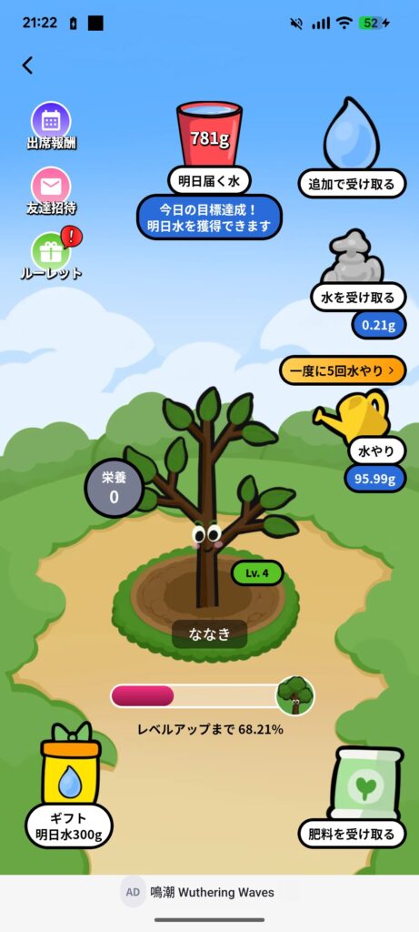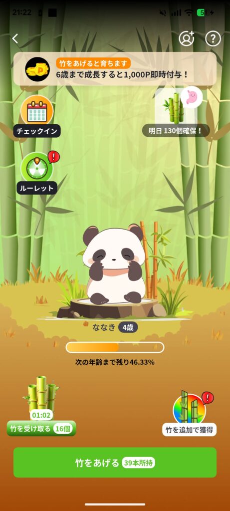 マネーウォークには、パンダや木を育てるミニゲーム機能もあります。お世話をするとポイントがもらえますが、ポイント目的で広告を見るのは少し面倒かもしれません。