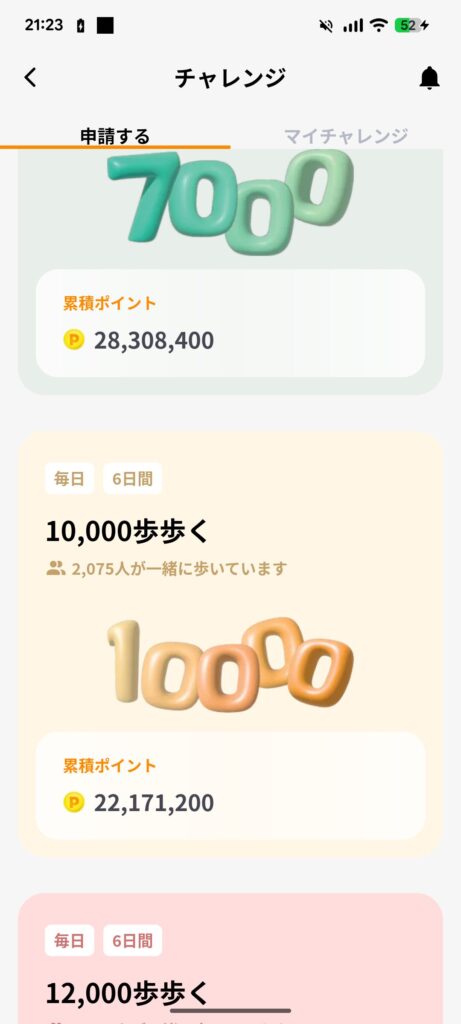 私がマネーウォークで最も気に入っているのが、この「ウォーキングチャレンジ」機能です。これは、自分のポイントを賭けて、設定された目標歩数を6日間連続で達成すると、賭けたポイントにボーナスが上乗せされて返ってくるというゲームです。
