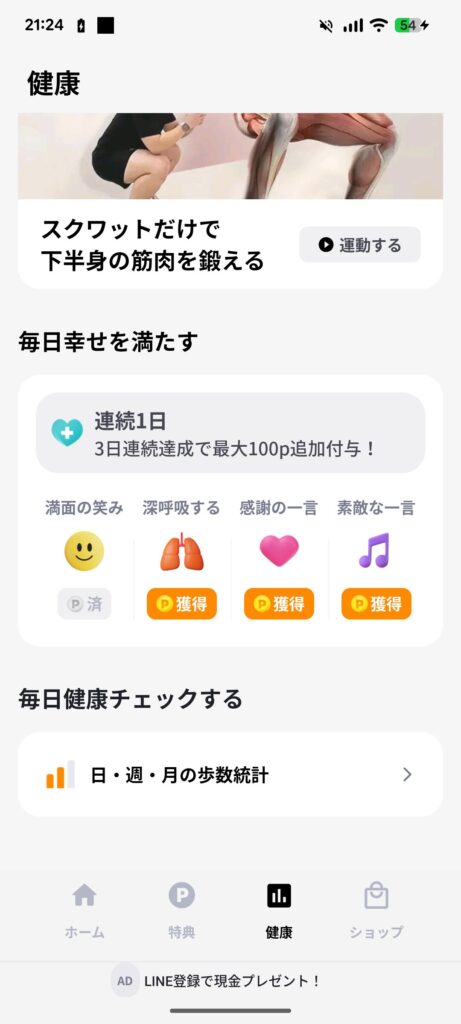 その他のポイント獲得契機としては、「健康クイズ」「メンタルヘルス」「アンケート」などがありますが、もれなく広告を見ることになるので私はパスしています。