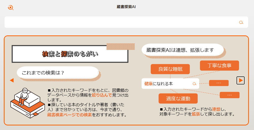 従来の蔵書検索は、書名や著者名がわからないと探すのが困難でした。しかし、このAI蔵書探索は「〇〇について知りたい」「△△な気分の時に読む本は?」といった、まるで司書さんに相談するかのような投げかけで本を探すことができます。