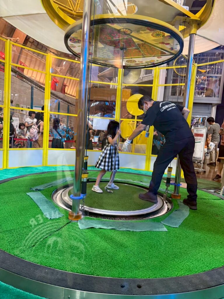 長時間のドライブで少し疲れたお子様のエネルギーを発散させるのに最適なスポットです。幼稚園生には少し難しい展示もありますが、体を動かせる屋内遊具が充実しているので、小さなお子様でも十分に楽しめます。写真は、娘が挑戦した巨大シャボン玉の中に入る体験です。