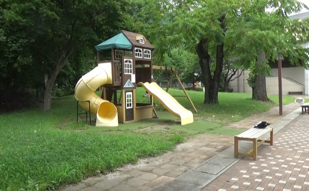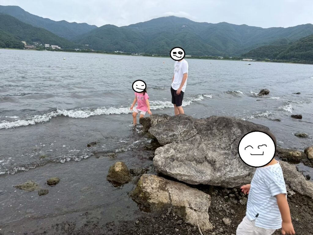 大きな遊具はありませんが、広々とした芝生が広がり、とても開放的な空間です。河口湖の浅瀬で水遊びをしたり、貝殻を拾ったりと、自然の中でゆったりとした時間を過ごせます。