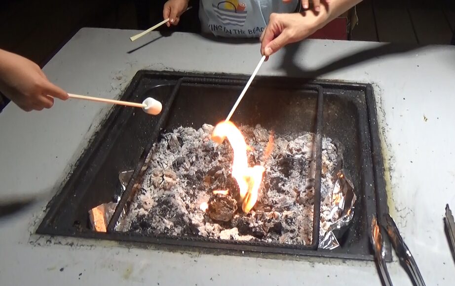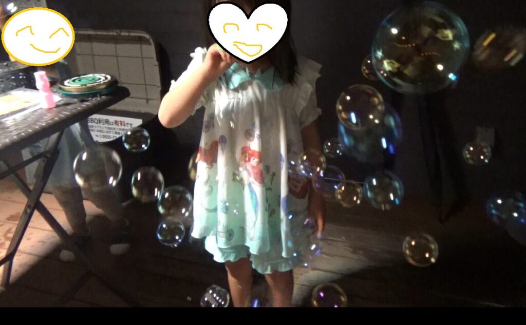 オーニング(雨除け)からテーブル・ファイヤピットがあり、は、BBQ機材付きプランなら、炭、着火剤、お皿、箸、トング、軍手、焼き網まで全て用意されています。食材さえあれば、すぐにBBQを始められます。マシュマロまで焼いてBBQと呼べるのです。終わった後はシャボン玉で遊ぶ子どもたち。そのあとは花火で楽しめました。