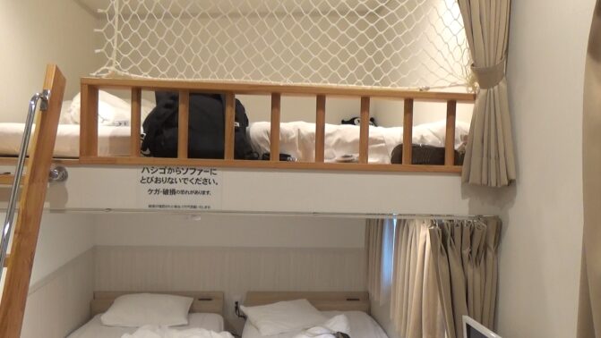 客室内の2段ベッドには落下防止ネットが付いているので、寝相が心配だったりやんちゃなお子様がいても安心です。室内には冷蔵庫や電子レンジが完備されており、食材の保管にも困りません。お風呂は子どもと一緒に入れる広さの湯船付き。トイレも非常に清潔で快適でした。