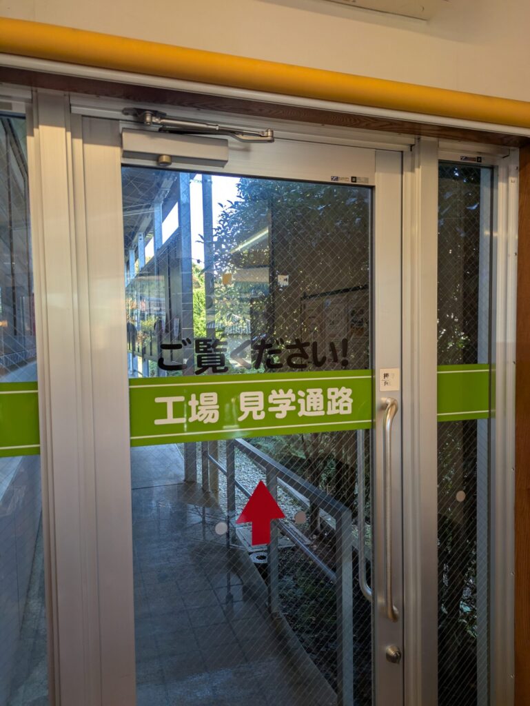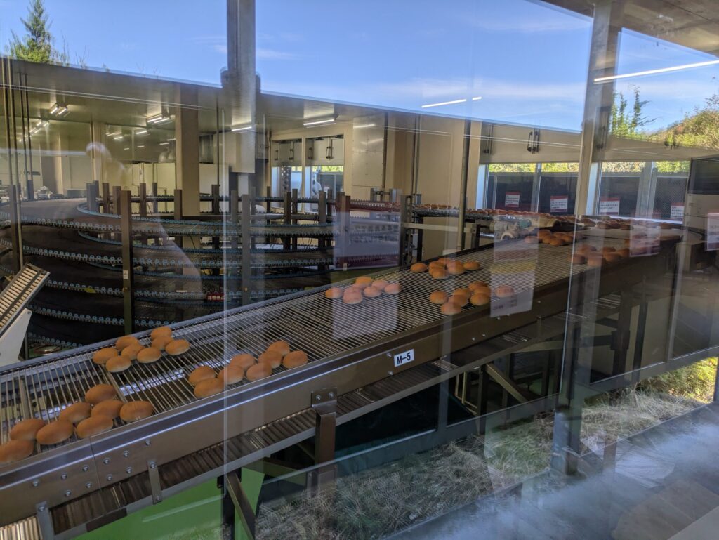 オギノパンの工場見学が持つ最大の魅力は、その手軽さにあります。駐車場からすぐの場所にある売店の扉をくぐると、その右手にはもう工場見学エリアへの入り口が待っています。驚くべきことに、事前の予約は一切不要で、特別な手続きや衛生服への着替えもなく、普段着のまま気軽にパン作りの世界を覗き見ることができるのです。私たちが訪れたのは平日の午前11時半過ぎでしたが、「あんドーナツ」がベルトコンベアに乗って流れていく様子を間近で見ることができました。熱を冷ますために設計された長い螺旋状のコンベアをゆっくりと旅していく光景は、製造ラインらしい光景で不思議な魅力がありました。