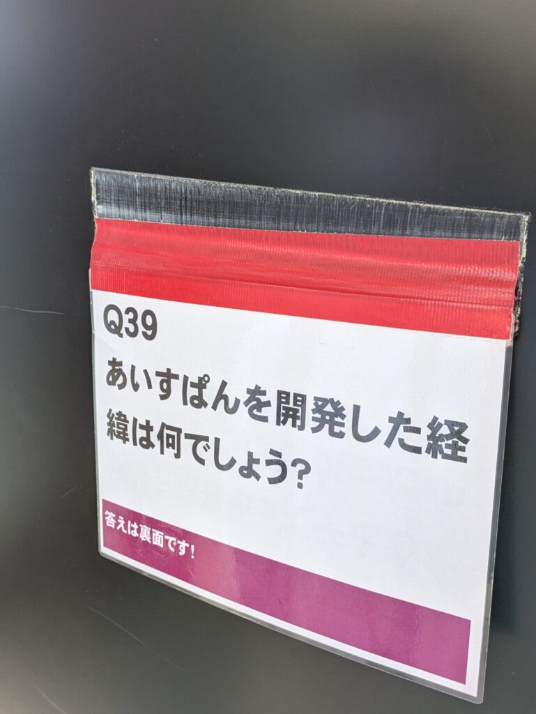 製造を眺めるだけでなく、子どもやおとながより深くパンの世界に興味を持つための素敵な仕掛けも用意されています。見学通路の壁には、「オギノパンの創業年はいつ?」や「あいすぱんを開発した経緯は?」といった、オギノパンへの理解が深まるクイズがずらりと40枚も貼られています。このカードは、めくると答えが現れるクイズ形式になっており、ただ見るだけの工場見学に留まらず、遊びながら学べる工夫がなされています。子どもも大人もすっかりオギノパン博士になった気分を味わうことができます。オギノパンが多くの家族に愛される理由の一つが、こうした企業努力にあるのかもしれません。答えはぜひ、現地で確かめてください!