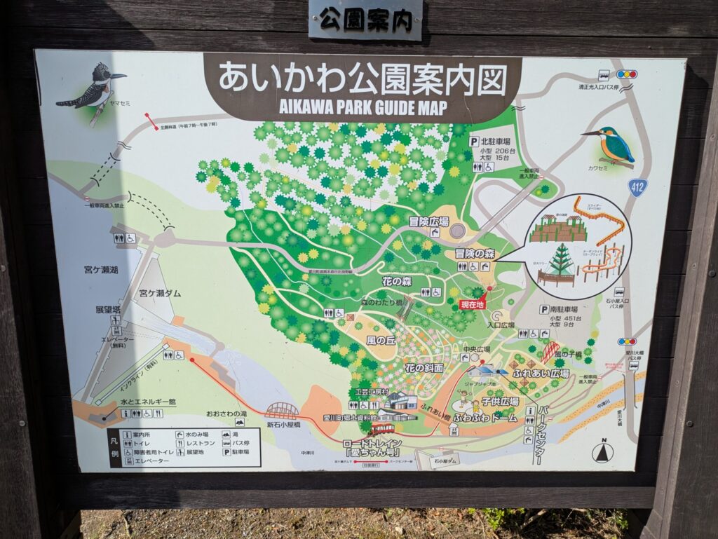 美味しいパンをたくさん買い込んだら、次なる目的地である「県立あいかわ公園」へと向かいます。オギノパン本店からは車でわずか5分という驚きの近さで、あっという間に到着します。ここで最高のピクニックランチと、午後のエキサイティングな時間を過ごしましょう。公園は非常に広大であるため、子どもの遊び場である「冒険の森」と「こども広場」へのアクセスを考えるなら、「南駐車場」を利用するのが断然おすすめです。駐車場は平日無料で、休日は500円で利用可能です。