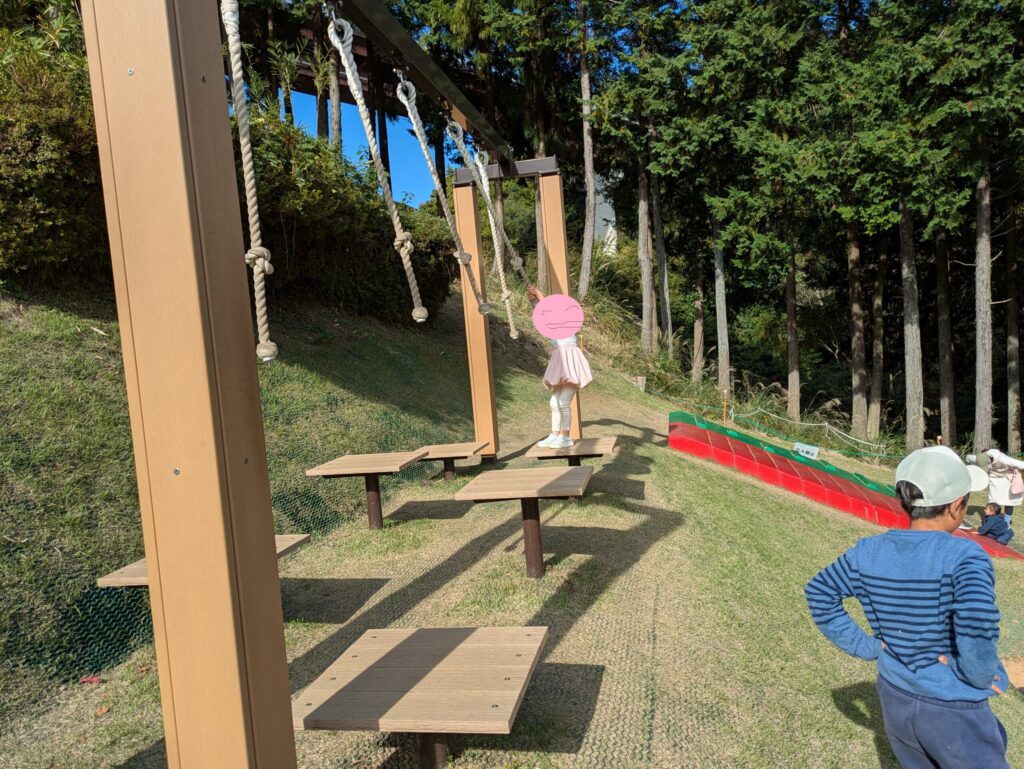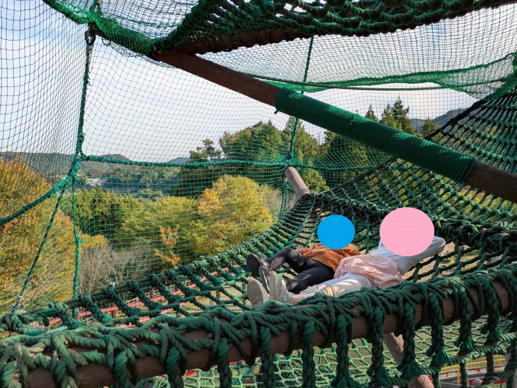 ここには、まるで砦のような壁の迷路や、ロープを編んで作られた巨大なツリー、そして定番のターザンロープやロング滑り台など、冒険心をくすぐる大型のアスレチック遊具が満載です。その本格的な造りは大人も本気にならざるを得ず、子どもを追いかけているうちに親の方が良い運動になります。筆者は翌日に案の定筋肉痛が太ももに来ました。幼稚園年少~年中さんくらいのお子さんには少し難易度が高い遊具もあるため、安全のためにも必ず保護者の方が付き添って一緒に楽しんでください。子どもたちはロープツリーでお昼寝ごっこもしておりました。