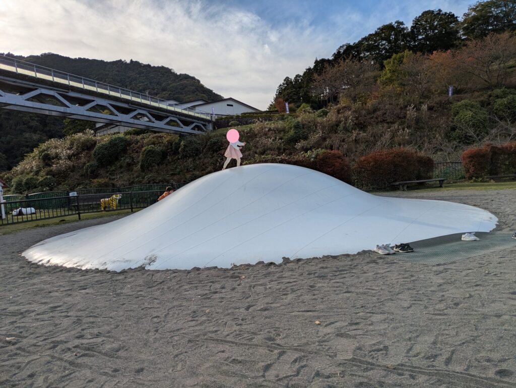みんなが一緒に遊べるインクルーシブ型の遊具が設置されており、公園の優しさを感じることができます。そして、子どもたちに大人気なのが、白い山型のトランポリン「ふわふわドーム」です。特筆すべきは、このふわふわドームが「小学生以上」と「小学生未満」でエリアが明確に分けられている点です。これにより、体の大きな子と小さな子が接触する危険性が低減されており、親としては心から安心して子どもを遊ばせることができます。すぐそばにベンチも設置されているため、休憩しながら子どもたちの楽しそうな姿を見守れるのも嬉しい配慮です。ふわふわドームは15時半までの利用可能なので、時間配分には気を付けてください。