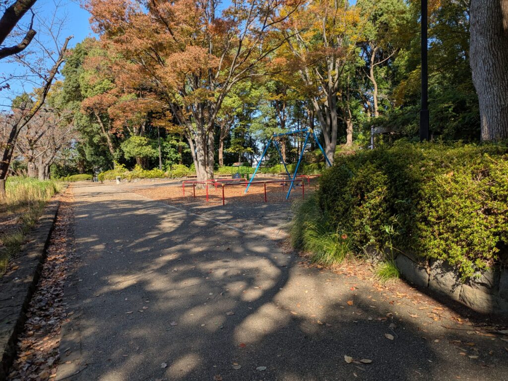もう一箇所は、公園の反対側、多目的広場に近い場所にあります。こちらにはブランコなどが設置されており、メインエリアの賑わいから少し離れて、落ち着いた雰囲気の中で遊ぶことができます。
