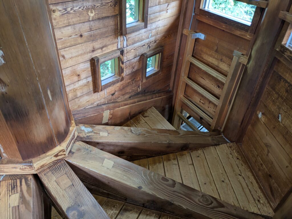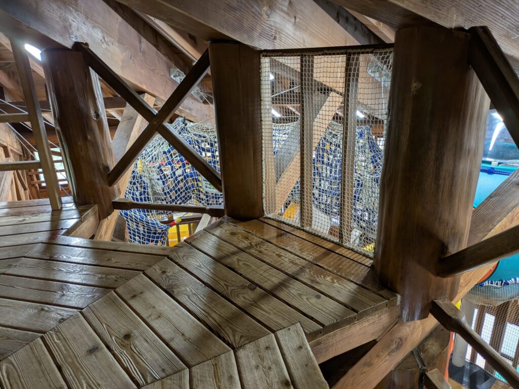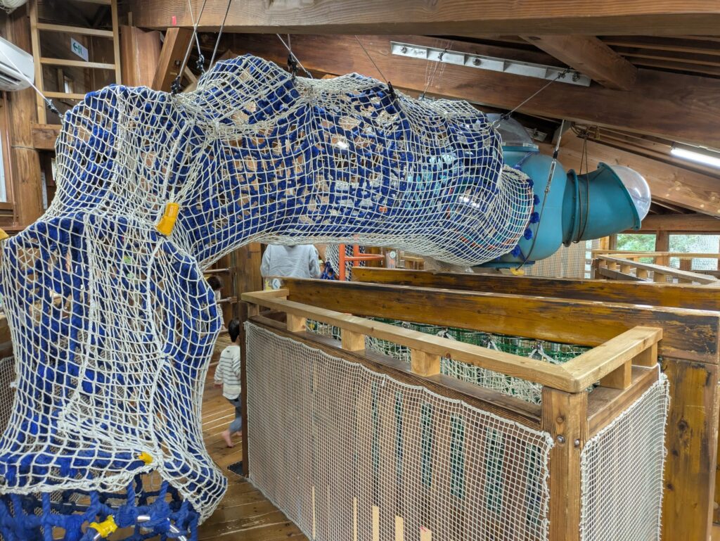 ログハウスの内部は、まさに木でできた冒険の砦です。らせん状の大きな滑り台や、揺れるネットの吊り橋など、子どもたちが全身を使って思い切り体を動かせるアスレチック遊具が満載です。さらに、階段を上って3階、4階へと進むと、そこにはまるで秘密基地のような隠れ家的スペース(地下迷路も)が広がっています。この空間は、探検家になったような気分を味わえ、特に小学生くらいのお子さんの冒険心を大いにくすぐることでしょう。
