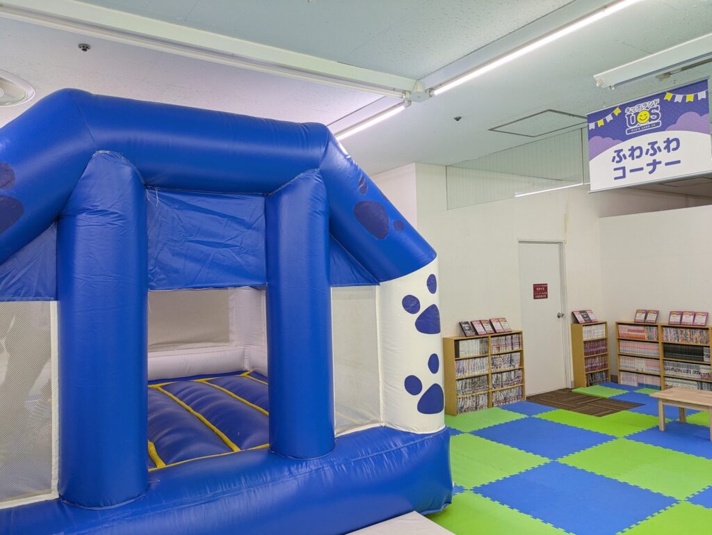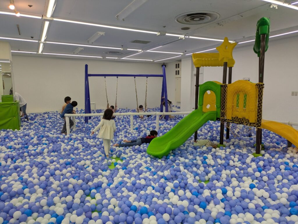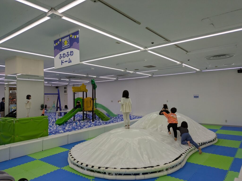 このエリアの主役は、真っ白で巨大な「ふわふわドーム」です。子どもたちはその上で跳ねたり転がったりと、全身を使って遊びに没頭します。隣にはボールプールやブランコといった定番の遊具も設置されており、飽きることなく体を動かし続けられます。