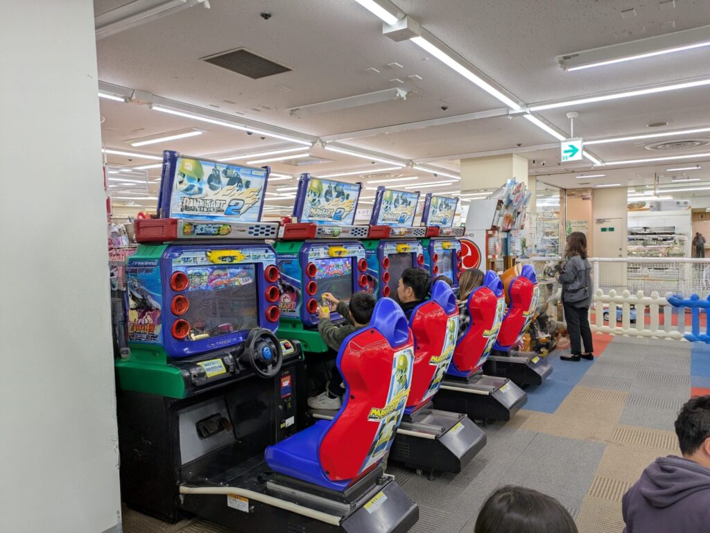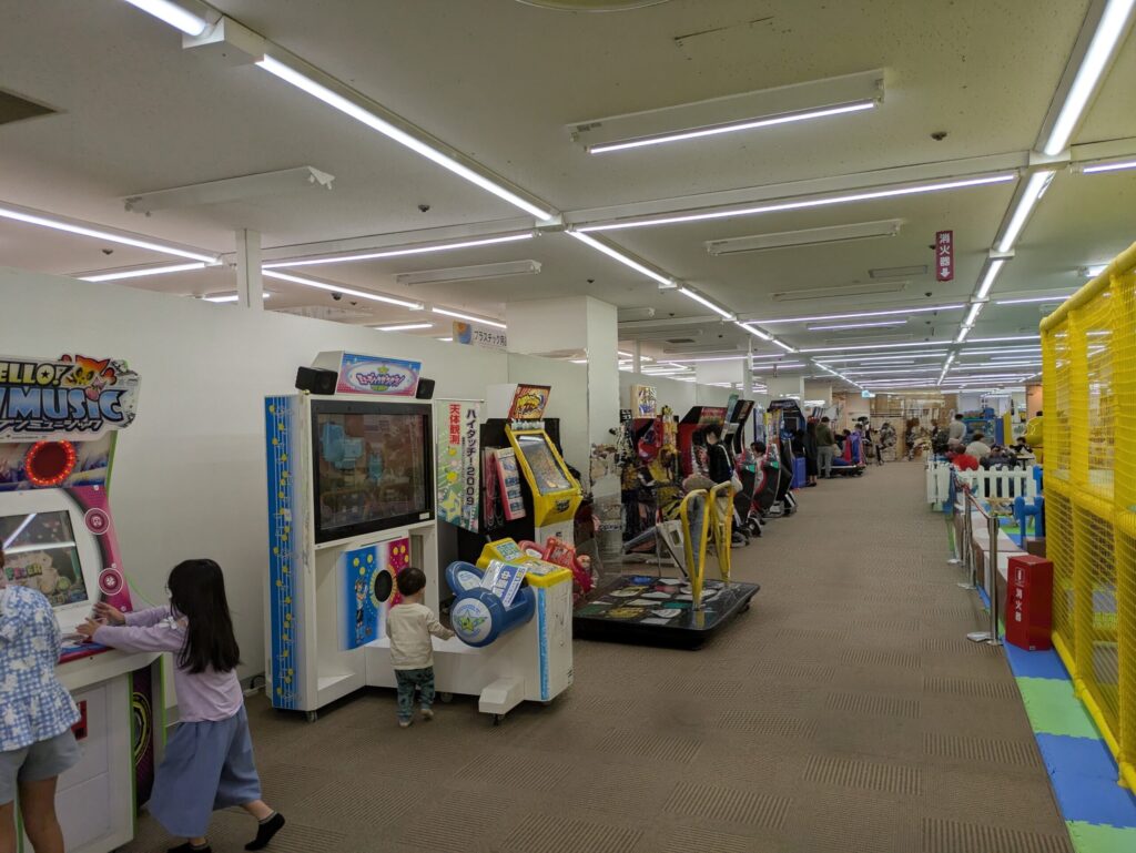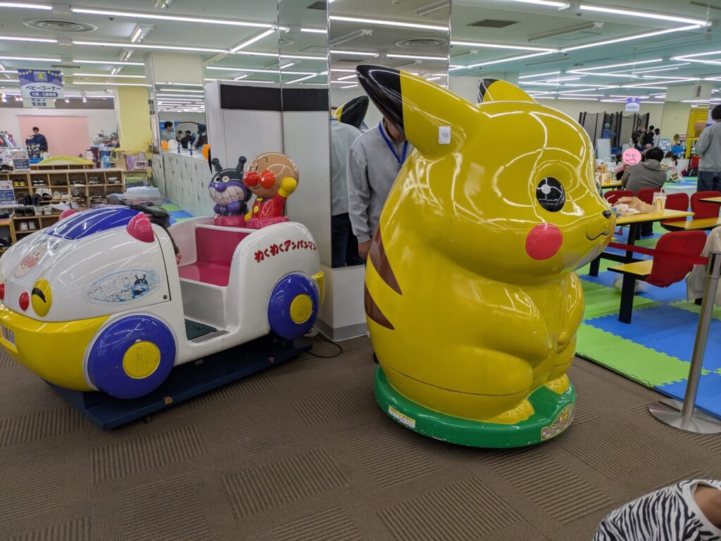 メインエリアの横手には、子どもたちが喜ぶ魅惑のアーケードエリアが広がっています。このエリアに設置されている全てのゲーム機が、追加料金一切不要のフリープレイで楽しめます。ゲームセンターで人気のマリオカートや、親子で盛り上がれるリズムゲーム、そして商業施設でお馴染みのピカチュウやアンパンマンの乗り物まで、すべてが遊び放題。普段は小銭持ってないから~という言い訳で我慢してもらったりしている筆者ですが、ここでは好きなだけ挑戦させてあげられました。
