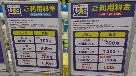 キッズランドUSの魅力の一つは、そのコストパフォーマンスの高さにあります。料金体系は平日と休日で異なり、滞在時間に応じたパック料金が設定されています。子どもはもちろん、付き添いの保護者にも料金が必要ですが、一日中遊べるフリーパスなどを選べば、時間を気にせず満喫できます。3時間パックで見ても筆者は他にも10か所程度は屋内の有料プレイエリアを利用したことがありますが、非常に良心的な価格設定であることは間違いありません。詳しい料金は公式サイトで確認しましょう!(2025年11月時点情報の為)