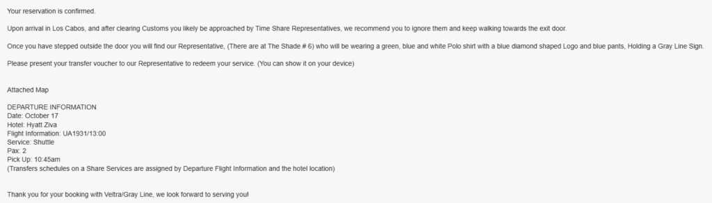 メキシコの空港に到着後、特に注意したいのがタクシーの客引きです。事前に調べていた情報通り、到着ロビーは多くの勧誘で溢れていました。咄嗟の判断が苦手な私は、圧倒されてしまいそうだと感じたため、オンラインで「ベルトラ」という会社の乗り合いシャトルバンを予約しておきました。これが結果的に大正解で、事前に送られてくる丁寧な案内メール(下図)のおかげで、指定された集合場所に迷うことなくたどり着き、スムーズに乗車できました。初めてのメキシコ旅行で地理に不安がある方や、余計な交渉事を避けたい方には、事前の送迎サービス予約を強くお勧めします。空港からハイアットジーヴァまでは、他のホテルをいくつか経由しましたが、それでも30分とかからずに到着しました。