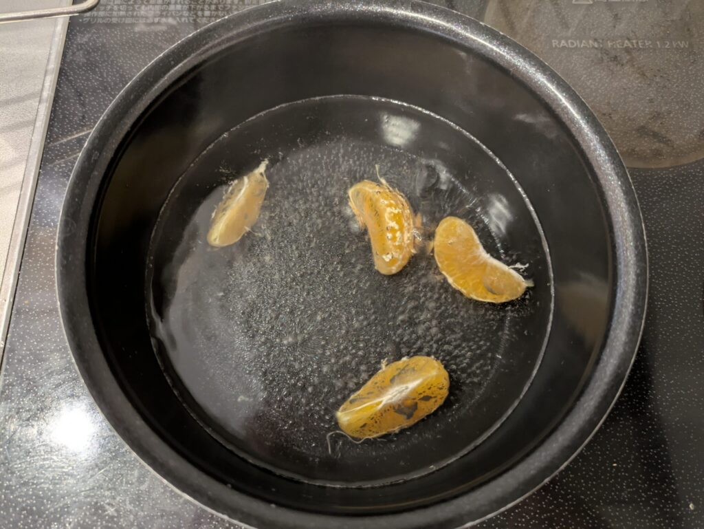 残念ながら、茹でる工程を経たみかんは、本来の甘みや酸味がかなり失われ、味が薄くなってしまいます。 特に重曹やクエン酸を使った場合は、その傾向が顕著でした。みかんのジューシーな美味しさをそのまま楽しみたい方には、少し物足りなく感じるかもしれません。