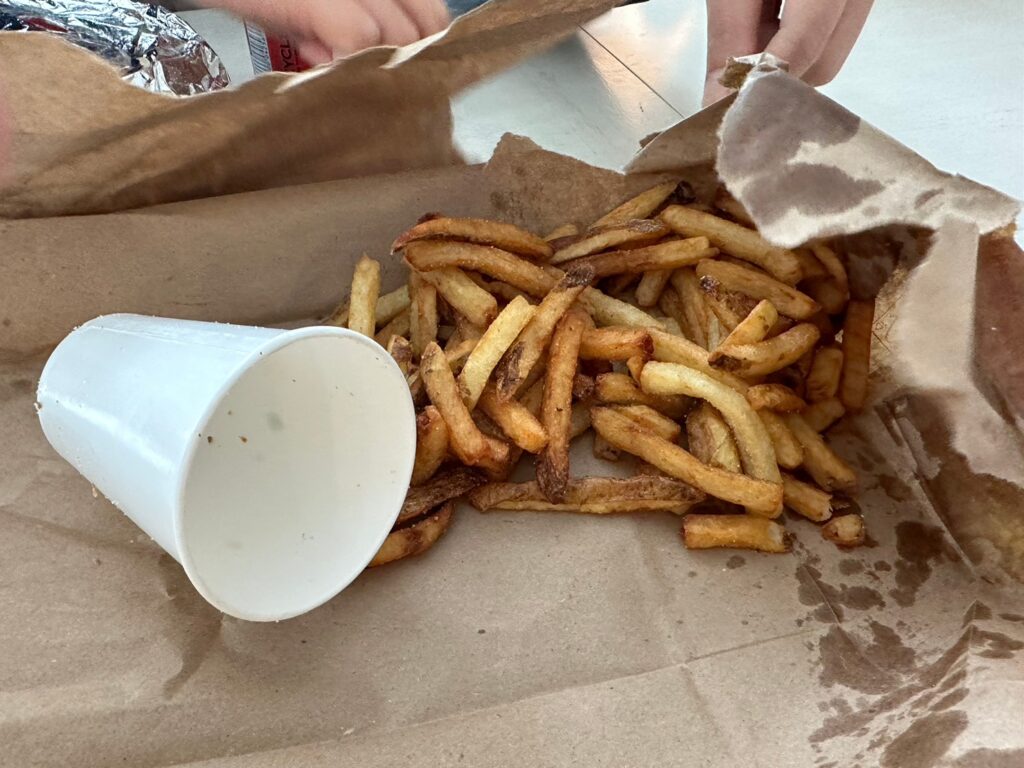 そして驚くべきはポテトの量。一番小さいサイズを頼んでもカップから溢れ出すほどで、そのサービス精神にはいつも圧倒されます。