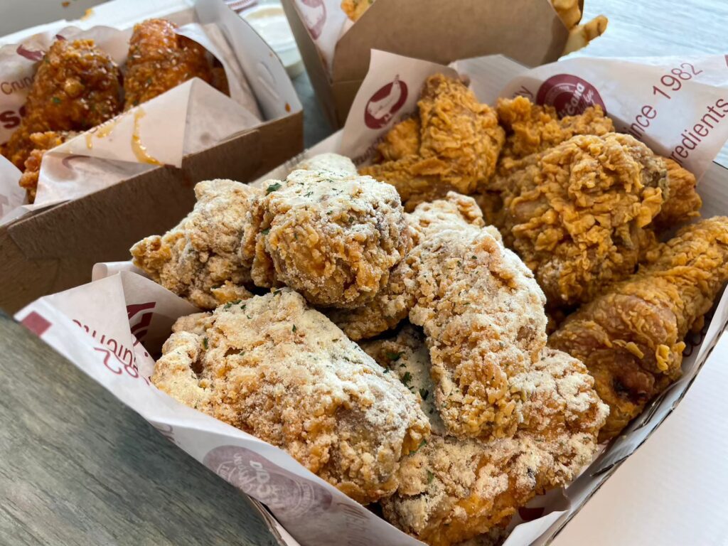 衣のザクザク感とスパイシーな味付けが特徴で、一度食べるとやみつきになります。ビスケットやケイジャンフライなどのサイドメニューも充実しています。